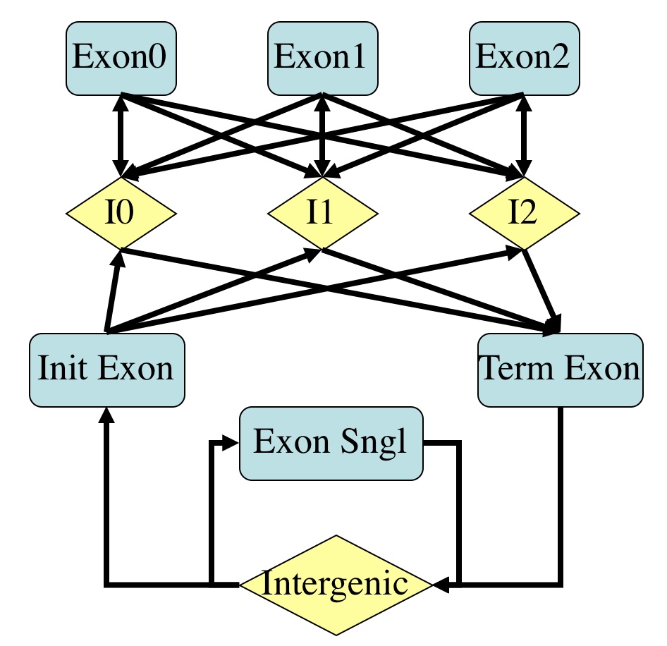 GlimmerHMM is a Generalized Hidden Markov Model ab initio gene-finder that incorporates GeneSplicer’s splice site models, and uses the same Interpolated Markov models (IMMs) as GlimmerM to distinguish coding DNA sequence. Additionaly it incorporates open-source training modules that make GlimmerHMM one of the few gene finders outside the bacterial realm where scientists or engineers other than the inventor could re-train the system and make it work for new species. GlimmerHMM has been trained for recognizing genes in many species, including human.
